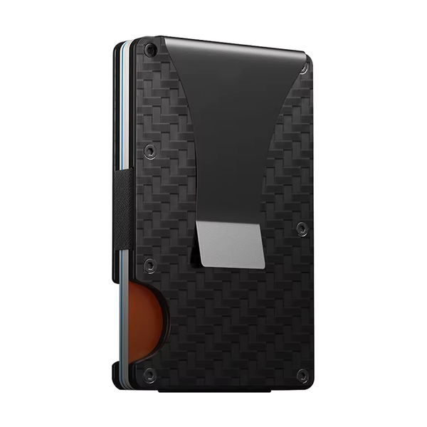 Minimalistična aluminijasta denarnica karbonskih vlaken in z črno kovinsko sponko za denar.