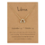 Ogrlica z obeskom astrološkega znamenja Tehtnica, izdelana iz cinkove zlitine s pozlačeno prevleko v zlati barvi. Prilagodljivo zapiranje omogoča dolžino 45-50 cm. Priložena je darilna kartica z opisom znamenja, kar jo naredi popolno darilo.
