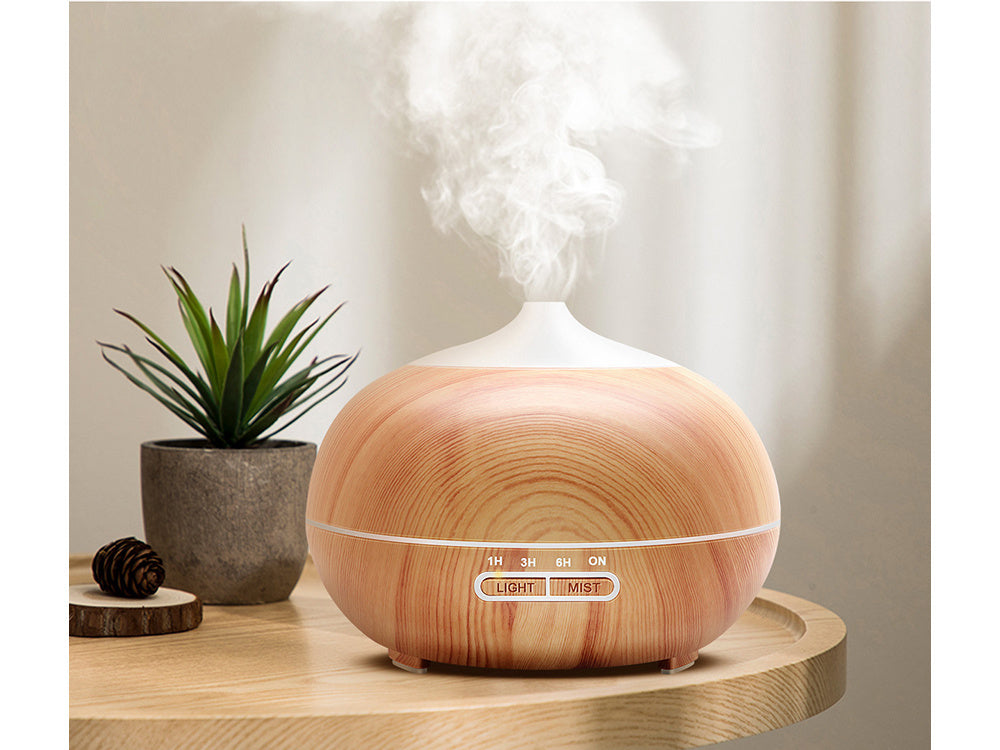 Ultrazvočni aroma difuzor z zmogljivostjo 400 ml ustvarja nežno meglico za odišavljen in vlažen zrak. Ima 7-barvno LED osvetlitev, časovnik (1h / 3h / 6h) ter samodejni izklop. Difuzor deluje izredno tiho (<30 dB), zato je primeren za uporabo v spalnici, pisarni ali dnevni sobi. Ohišje v svetlo rjavem lesnem videzu se lepo poda v vsak ambient.